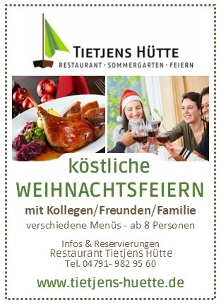 Weihnachtsgebäck und Dominosteine sind schon lange in den Läden; jetzt wird es wirklich Zeit, sich um die Weihnachtsfeier zu kümmern. Tietjens Hütte bietet für Gruppen ab 8 Personen spezielle Menüs … mehr Infos